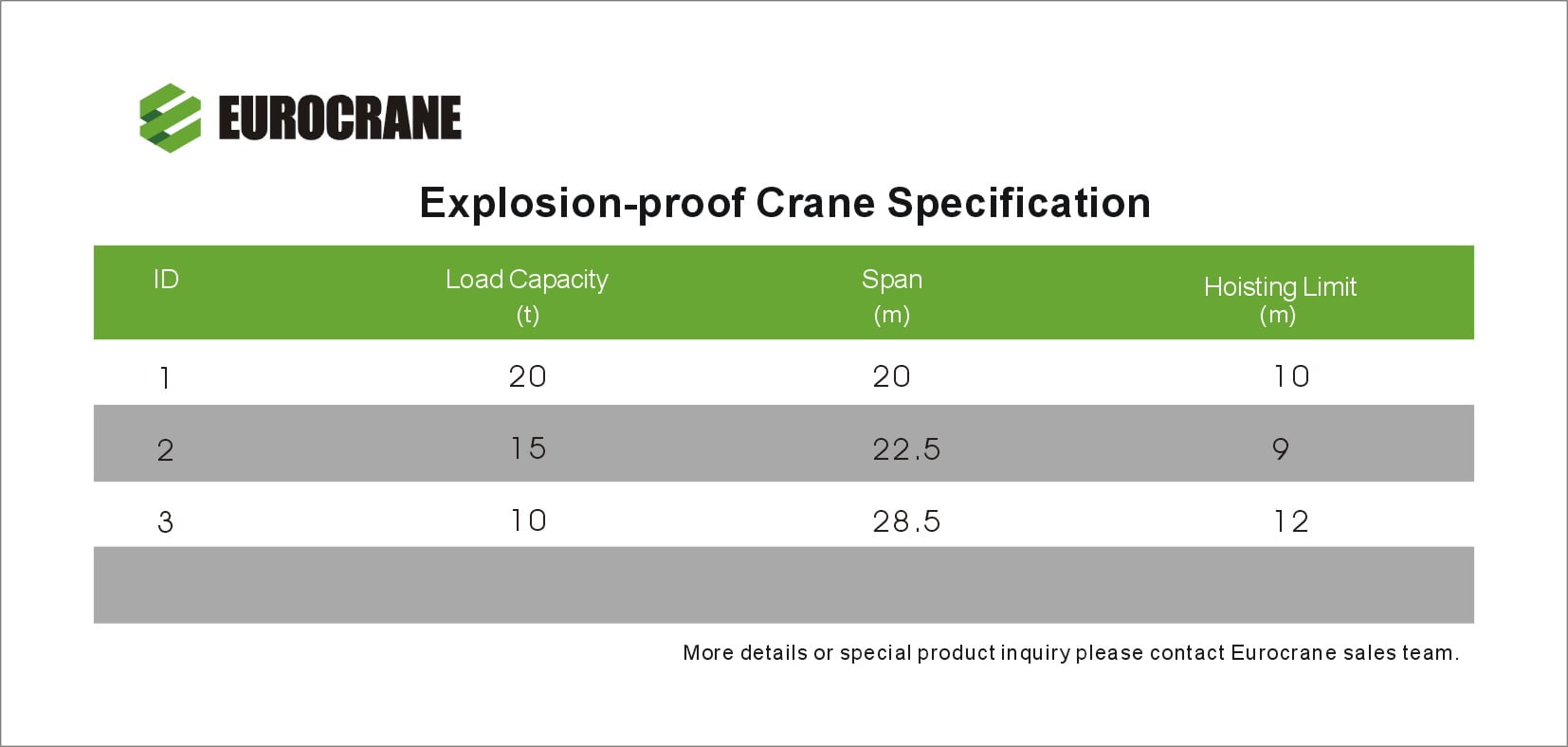 Sản phẩm Cầu trục chống cháy nổ bao gồm các loại chống cháy nổ: môi trường khí (zone 1 và 2), môi trường bụi (zones 21 và 22). Sản phẩm chống cháy ở môi trường khí phù hợp với các Class A/B/C, và vùng nhiệt độ T4, cấp độ bảo vệ đạt IP66. Loại chống cháy nổ ở môi trường bụi được ứng dụng chống cháy nổ ở nhiều nhóm bụi khác nhau, dùng trong vùng nhiệt độ T4.